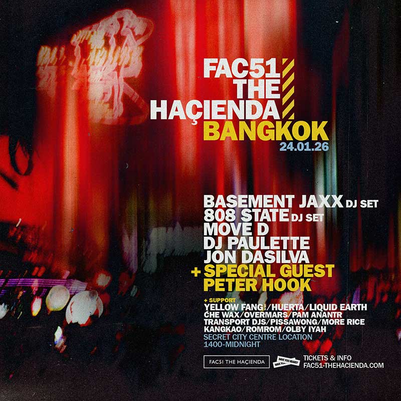 นอกจากนี้ ยังได้รับเกียรติจาก Peter Hook ผู้ก่อตั้ง Joy Division และ New Order ซึ่งเป็นเจ้าของดั้งเดิมของ FAC51 THE HAÇIENDA ที่จะมาโชว์ DJ Set สุดพิเศษ ถ่ายทอดมรดกทางดนตรีและทัศนคติที่หล่อหลอมวัฒนธรรมคลับตั้งแต่อดีตจนถึงปัจจุบันให้เราได้สัมผัสกันแบบใกล้ชิด พร้อมทัพศิลปินระดับโลกอย่าง 808 State, Jon Dasilva และ DJ Paulette ที่พร้อมจะระเบิดความมันส์แบบ Acid House ให้สั่นสะเทือน